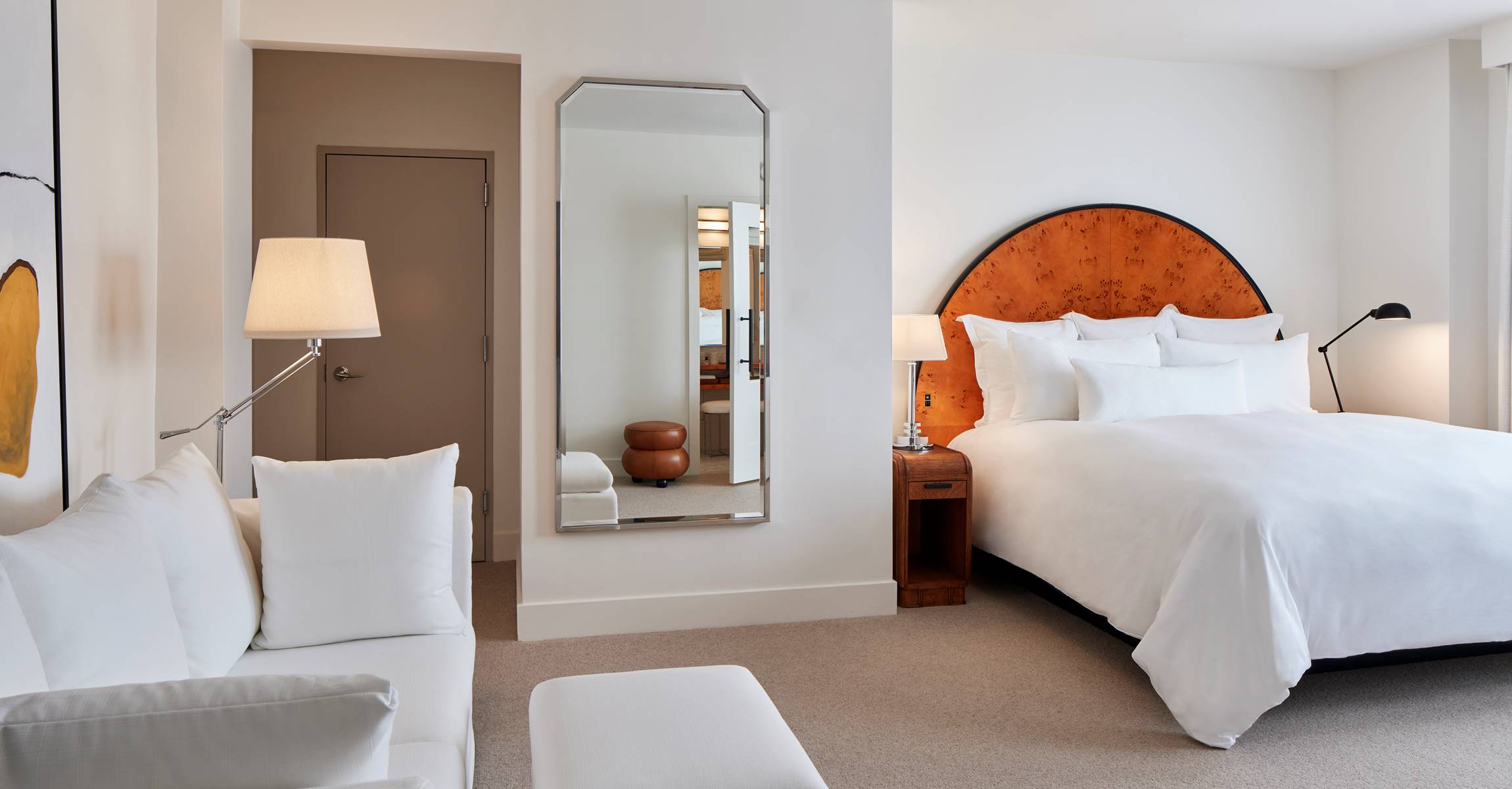 With its neutral palette and use of natural materials, the spacious Premier King with Kitchenette has a comforting, residential feel anchored by a bespoke art deco burl wood headboard and the added flexibility of the kitchenette features.